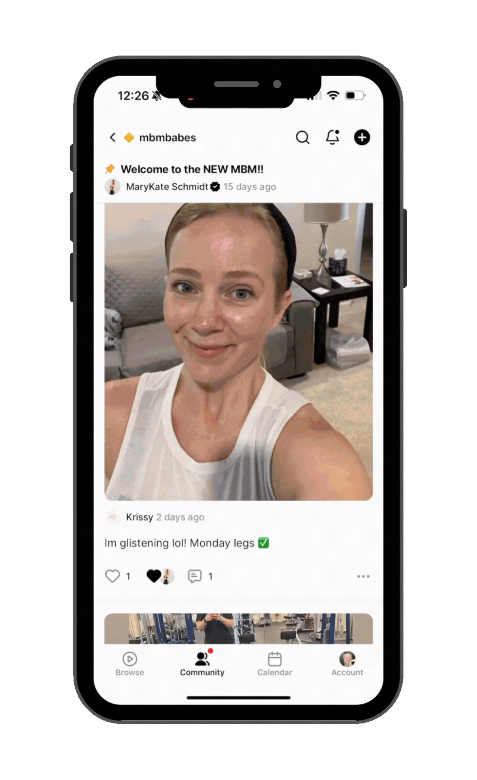 Access to the MBM App where you can conveniently track your workouts with the NEW calendar feature, talk directly to MK and the community, and bring the workouts with you anywhere, anytime!